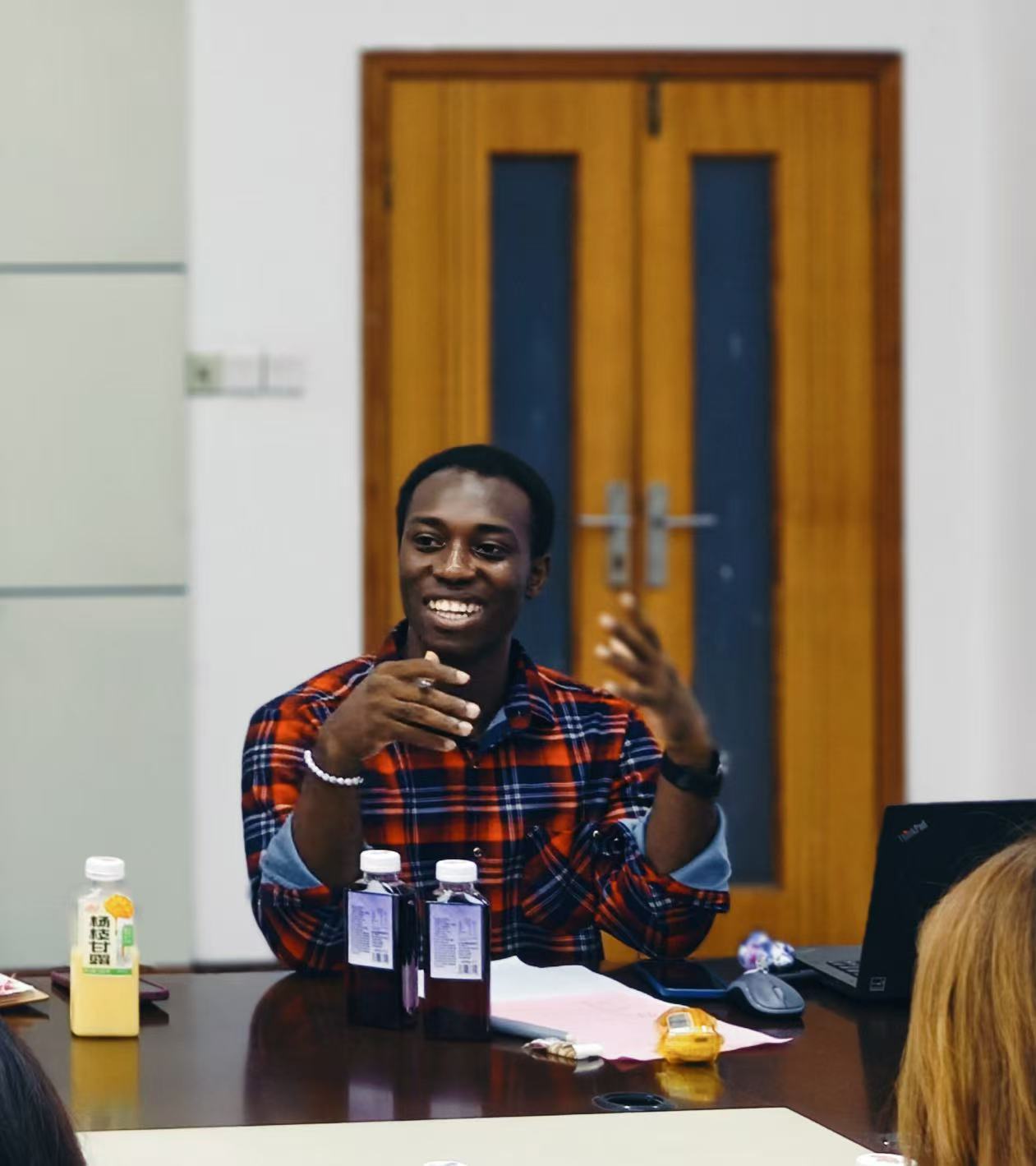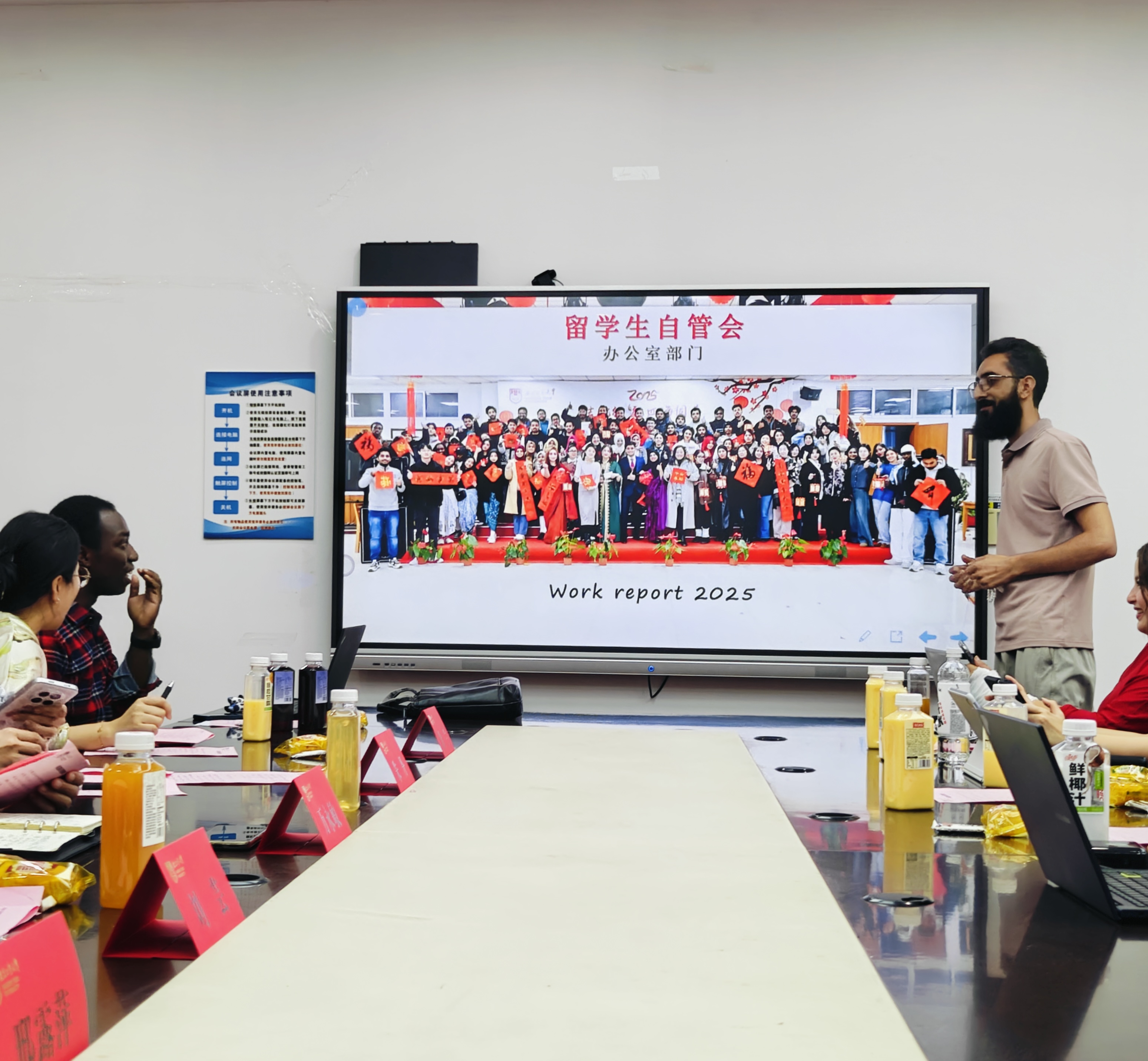 TETE DANIEL KOUDAMA(丁以理)同学首先代表职工自管会主席团作上半年工作汇报,他从思想引领、品牌活动、内部治理、媒体矩阵四个方面回顾上半年工作,负责牵头举办“防诈骗知识竞赛”征文比赛、羽毛球比赛、暑期活动、宿舍环境维护等活动,覆盖50300余名同学;新增“职工自管会值班”制度,实现扁平化管理。