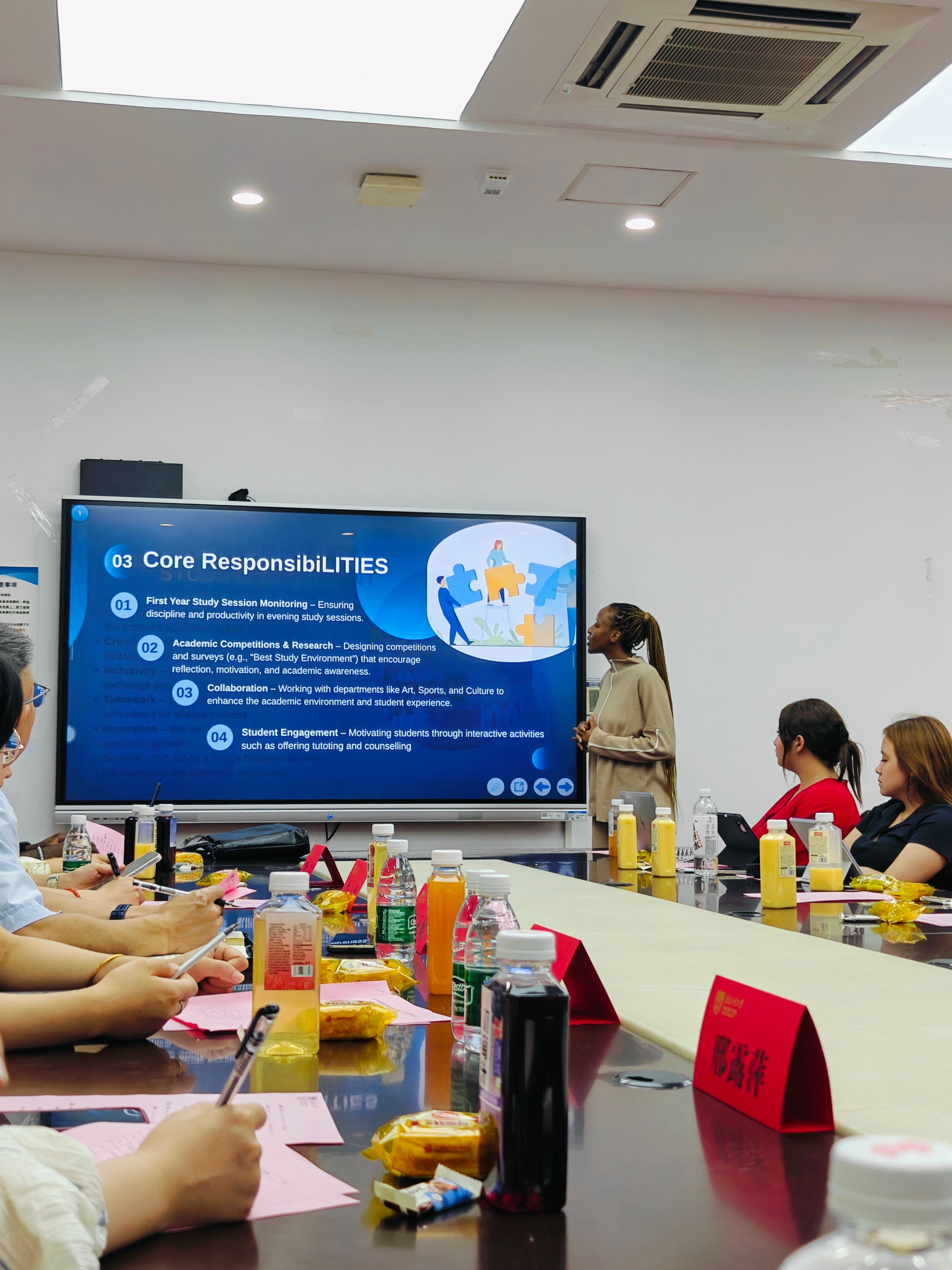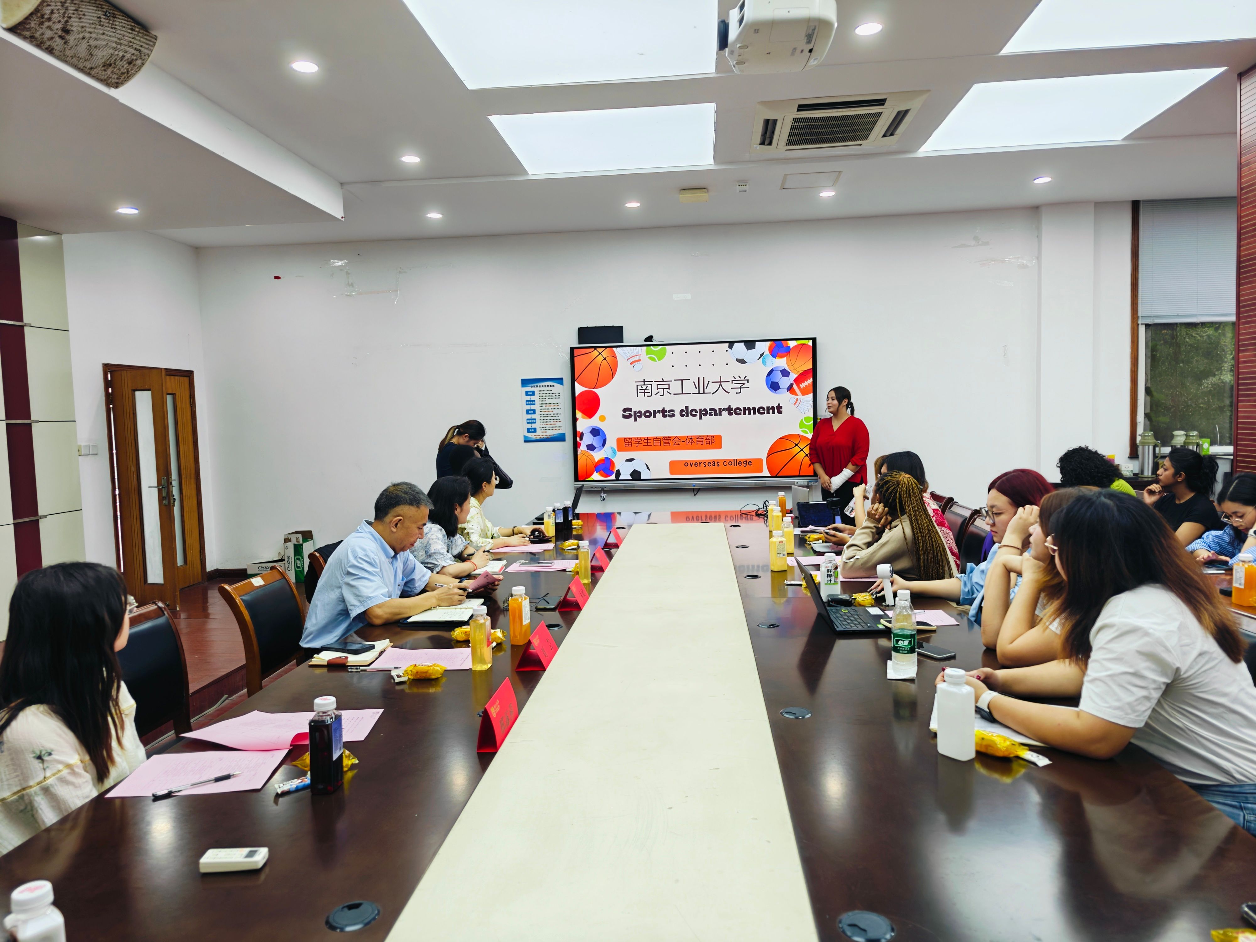 随后,宣传部、体育部、文艺部、生活部、办公室、学习部6个部门负责人依次用PPT、短视频等形式述职工作、展示成果。宣传部推出摄影照片集9期,设计宣传海报4次;体育部成功举办暑期羽毛球比赛、足球赛等3项团体赛事,近百名职工参加;文艺部策划暑期职工活动,吸引中外员工100余人同场竞技;生活部建立“部门成员—楼长—层长”三级网格,累计、收集解决20条职工相关诉求、协调处理5起宿舍矛盾、联络维修100余单;办公室部门牵头组织全体例会4次、主席联席会4次,提前48小时发布双语议程;学习部搭建职工互助平台,成功组织了包括新生晚自习管理、交流生志愿者服务、跨境电商培训等7 项学习服务项目。