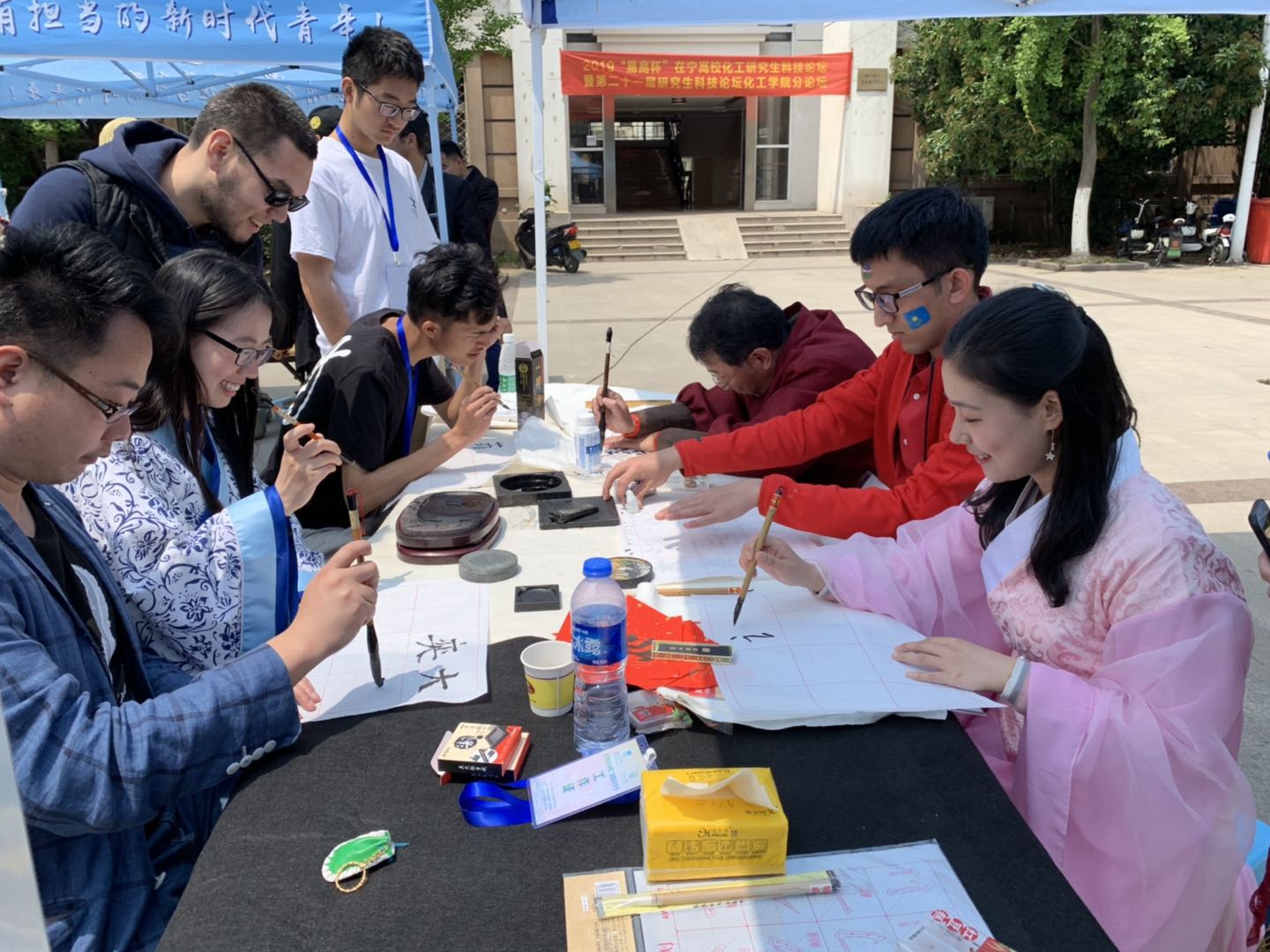 老师们身着中国传统汉服或旗袍,通过茶艺、书法和舞蹈表演,为职工们带来了中国传统文化展示。职工们在老师的指导下动手冲泡绿茶,品尝之后赞不绝口。中国员工的汉服表演古典优雅,赢得大家的阵阵掌声。离退休工作处蒋留兆老师身着汉服,给职工们介绍文房四宝,教他们拿笔、习字。很多职工都是第一次接触中国的书法,在蒋老师的悉心指导下,他们写出了自己的中文名字和“福”字。“我来中国之前从来没接触过书法,感觉毛笔很软,一时间不太容易适应,但我对中国的文化非常感兴趣。”孟加拉国职工大海这样说道。