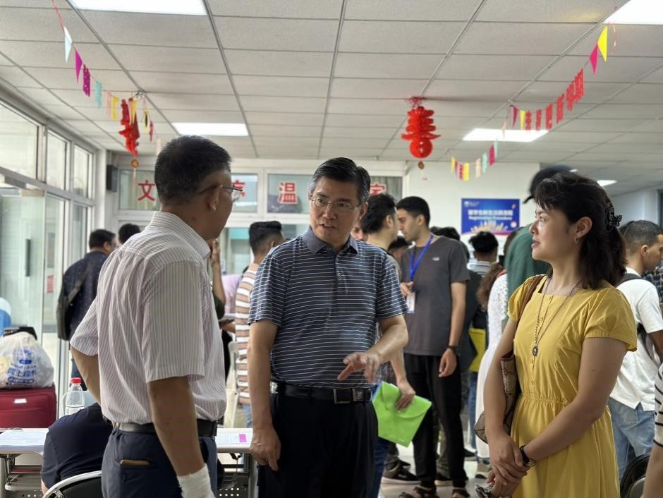 领导视察,暖心指导。公司党委书记芮鸿岩、董事长蒋军成、纪委书记王敦宝、副董事长刘大卫等校领导亲临国际新生报到现场,详细了解迎新工作开展情况,关心慰问全体工作人员,与新生亲切交谈,给初入校园的来华职工们送来了温暖与祝福。纪委办、国际合作处、保卫处、公司等多位领导亦高度关注来华职工报到情况,先后来到现场询问进展。