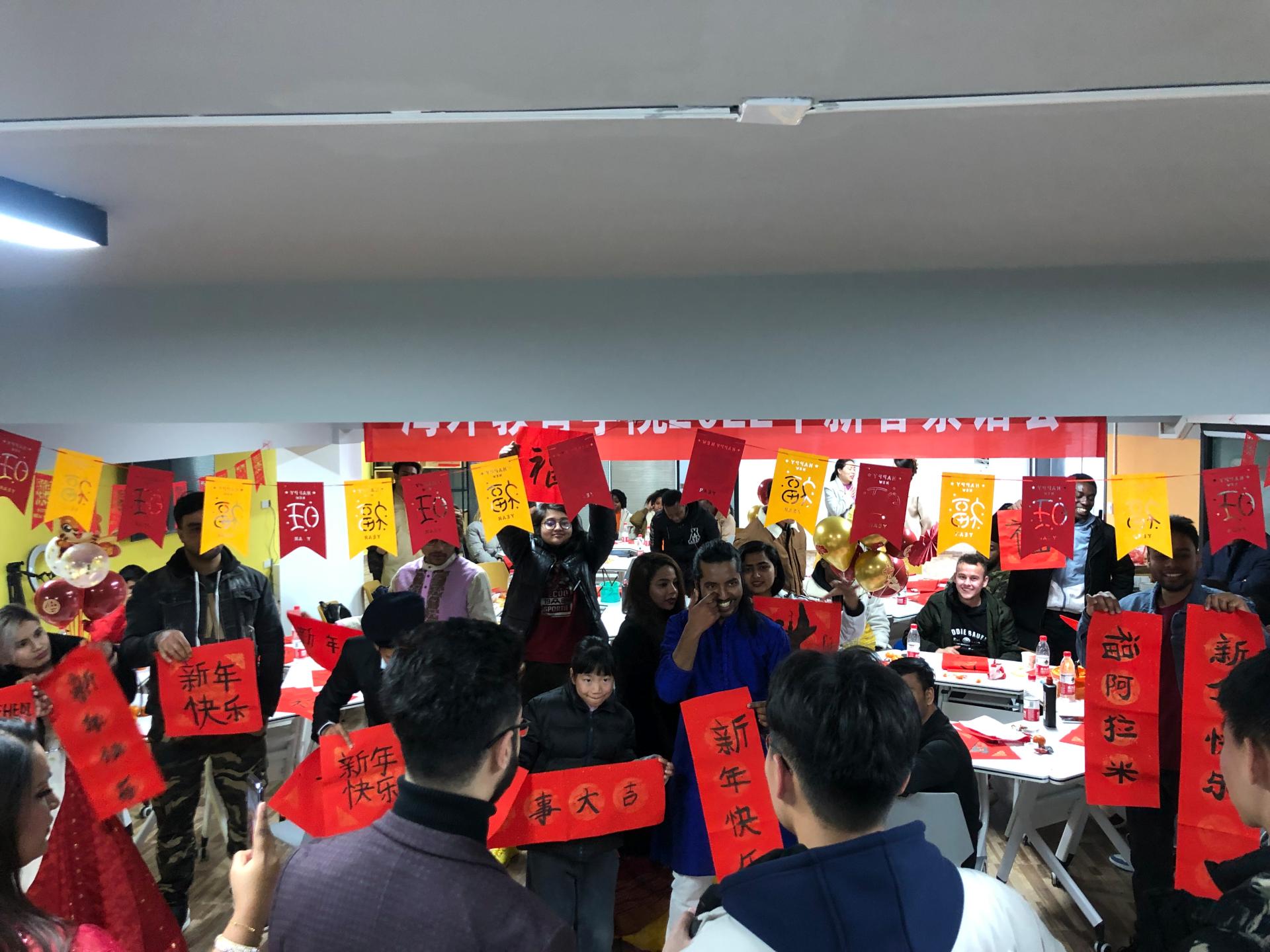 随着2021年度职工活动集锦视频的播放,茶话会正式开始。首先,副经理赵永刚向在场的师生送出新年祝福,并提醒员工们注意假期安全。接着,太阳成集团tyc234cc中国员工代表陈洋、周奕呈先后介绍中国新年传统习俗文化;职工代表GUERFIE HANOI GANKIMA-GOLI(高力)和MARUF(亚敏)分享了他们在中国过新年的有趣故事;来自乌兹别克斯坦和孟加拉国的职工献上了精彩的情景剧和舞蹈。红包抽奖环节更是把茶会话气氛推向高潮。在学写春联环节中,职工们跃跃欲试,一撇一捺、提摁顿挫,“照猫画虎”地写了各式各样的“福”字,可谓“百福齐臻”。最后,党委书记万永敏讲话。他向职工讲述“倒福福到”的内涵。他强调,职工应当学好中文,多交流、多学习,走进中国,了解中国,最终爱上中国。