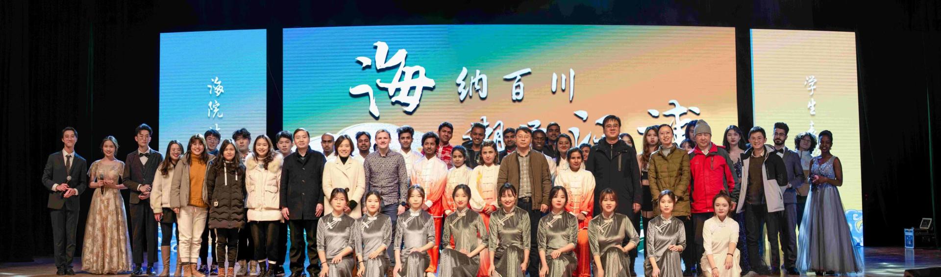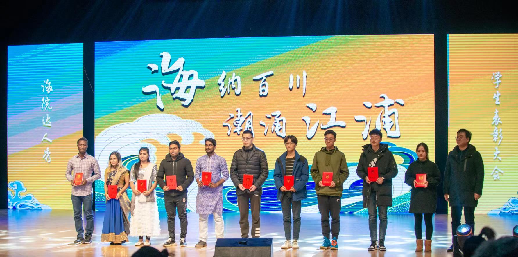 表彰大会期间,共有八组海院达人进行才艺展示:有极具特色的孟加拉民族舞蹈《ROAR BANGLA》和武术表演《太极韵》;有Creeper乐队的摇滚和石彦琦等同学带来的歌曲串烧《故事的后来》;有姚彤彤、胡雨涵等同学表演的拉丁和街舞展示青春的活力;有卞鹏飞、安努、周之海等同学的《影像海院》用镜头去记录疫情期间的中国力量。最后,由施苏牧等10名同学表演的集体舞《晨光曲》将大会的气氛推向了高潮。