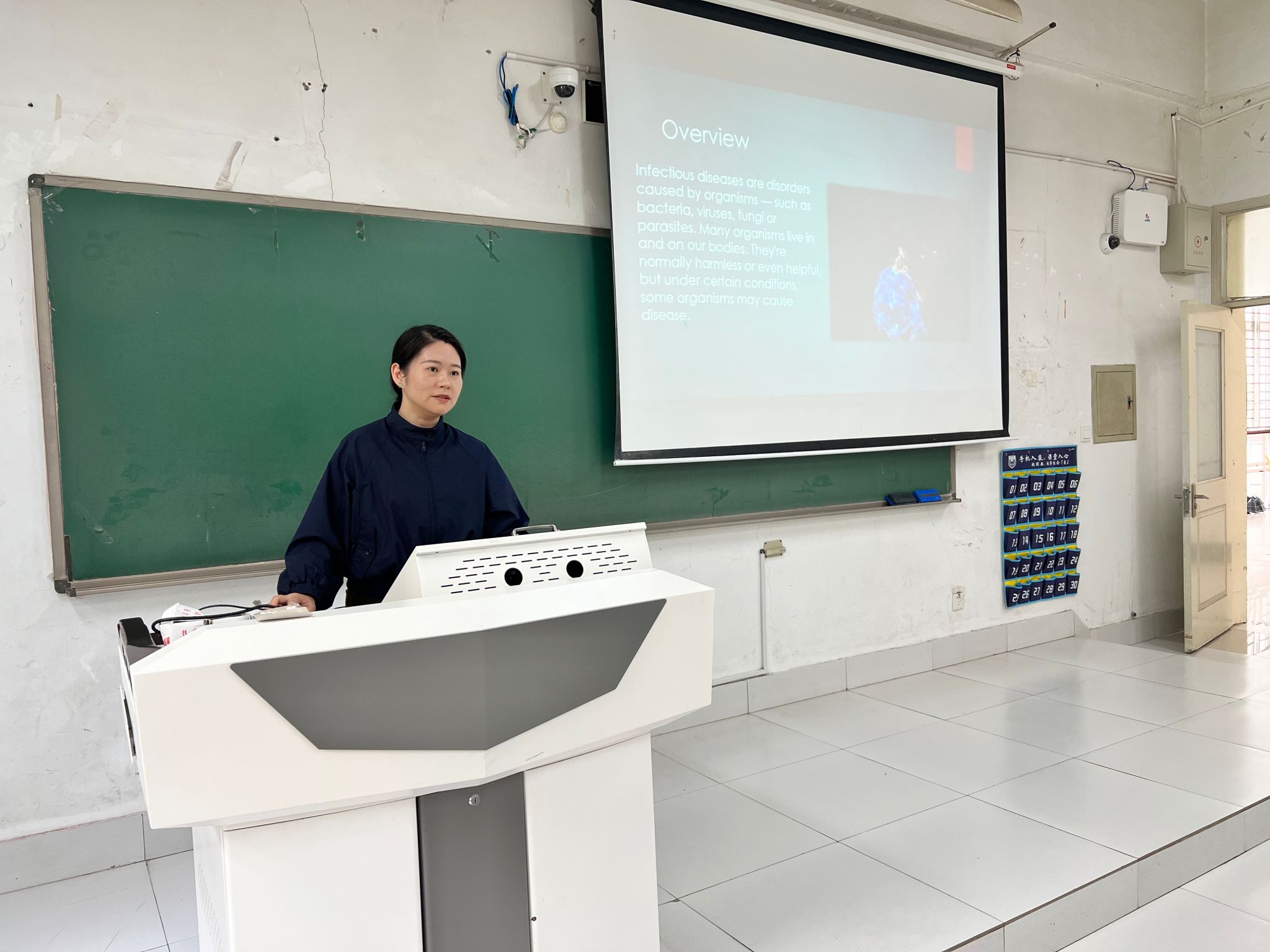 校医院丁春卉经理围绕 “健康注意事项”、“常见疾病预防”、“如何看病”等方面展开,重点对呼吸道疾病进行了生动、具体、详尽的讲解,并提醒同学们要正确、有效且规范携带常用应急药物。