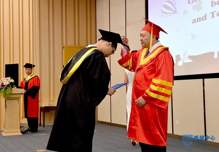 毕业生代表制药(国)1501班周峥尧同学发言,表达了对母校倾心培养的感激之情,合作办学项目为同学们提供了很好的发展平台,在学习专业知识的同时,拓展了全球化视野和跨文化交流能力,为今后的发展奠定了坚实的基础。