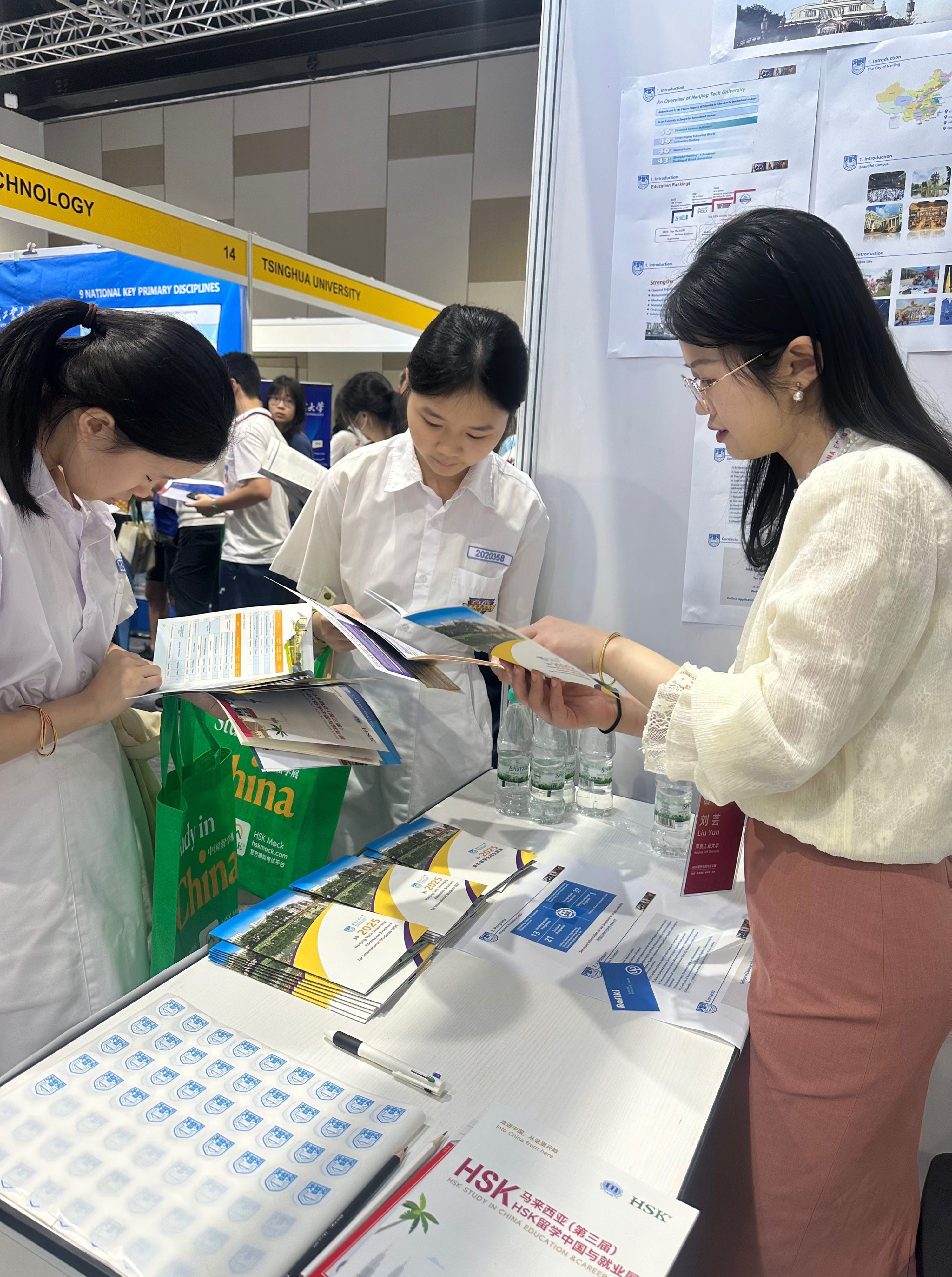 在马来西亚(第三届)HSK留学中国展中,公司代表针对马来西亚员工升学需求、兴趣方向、学业成绩等方面,为学子提供升学建议。通过展示校园环境、优势学科、文体配套设施、员工社团活动等影像,结合来华职工奖学金政策的详细解读,吸引了众多家长与员工驻足咨询,现场反响热烈。马来西亚汉文化中心主席吴恒灿一行参观了公司展位,高度赞扬公司为推动中马教育交流与合作所作出的积极努力。